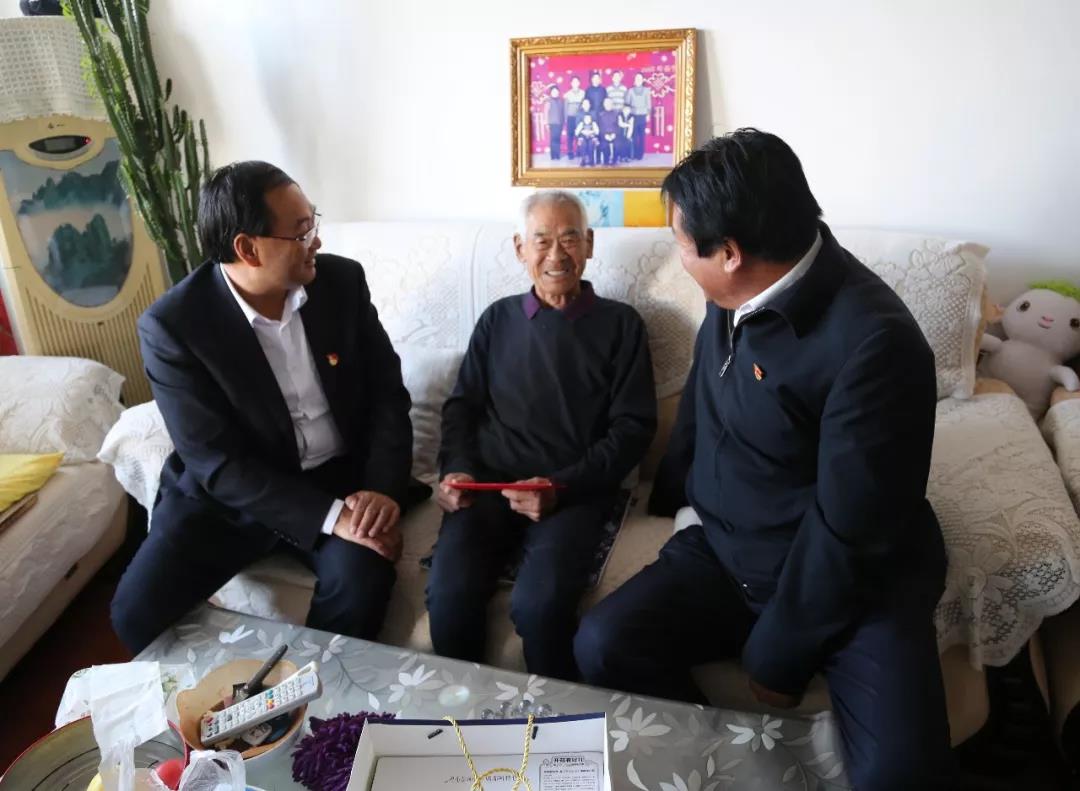 圖為集團(tuán)公司黨委副書記祁生珠到青墾大廈退休老黨員曹積占家中走訪慰問(wèn)。