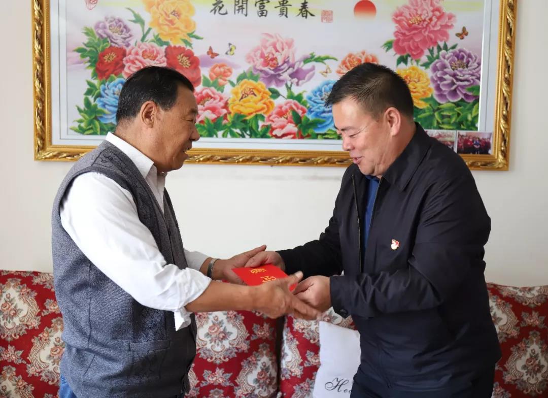 圖為集團(tuán)公司黨委副書記祁生珠到門源種馬場(chǎng)退休老黨員陳仁家中走訪慰問(wèn)。