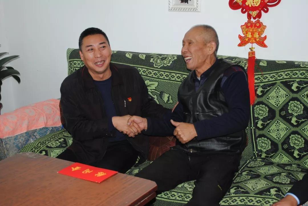 圖為集團(tuán)公司黨委書記、董事長(zhǎng)馬榮華到貴南草業(yè)公司退休老黨員王振山家中走訪慰問(wèn)。